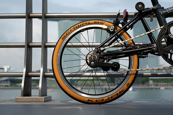 The Schwalbe Kojak Tanwall Tyre was first introduced on the Limited Edition Brompton CHPT3 and has since become a popular choice for riders seeking a lightweight, fast-rolling slick tyre. It features a RaceGuard lining for added puncture protection, a Kevlar folding bead for reduced weight and portability, and a classic tan wall finish for a distinctive look. The Kojak can be folded down for travel or carried as a spare, making it ideal for commuting and performance riding.